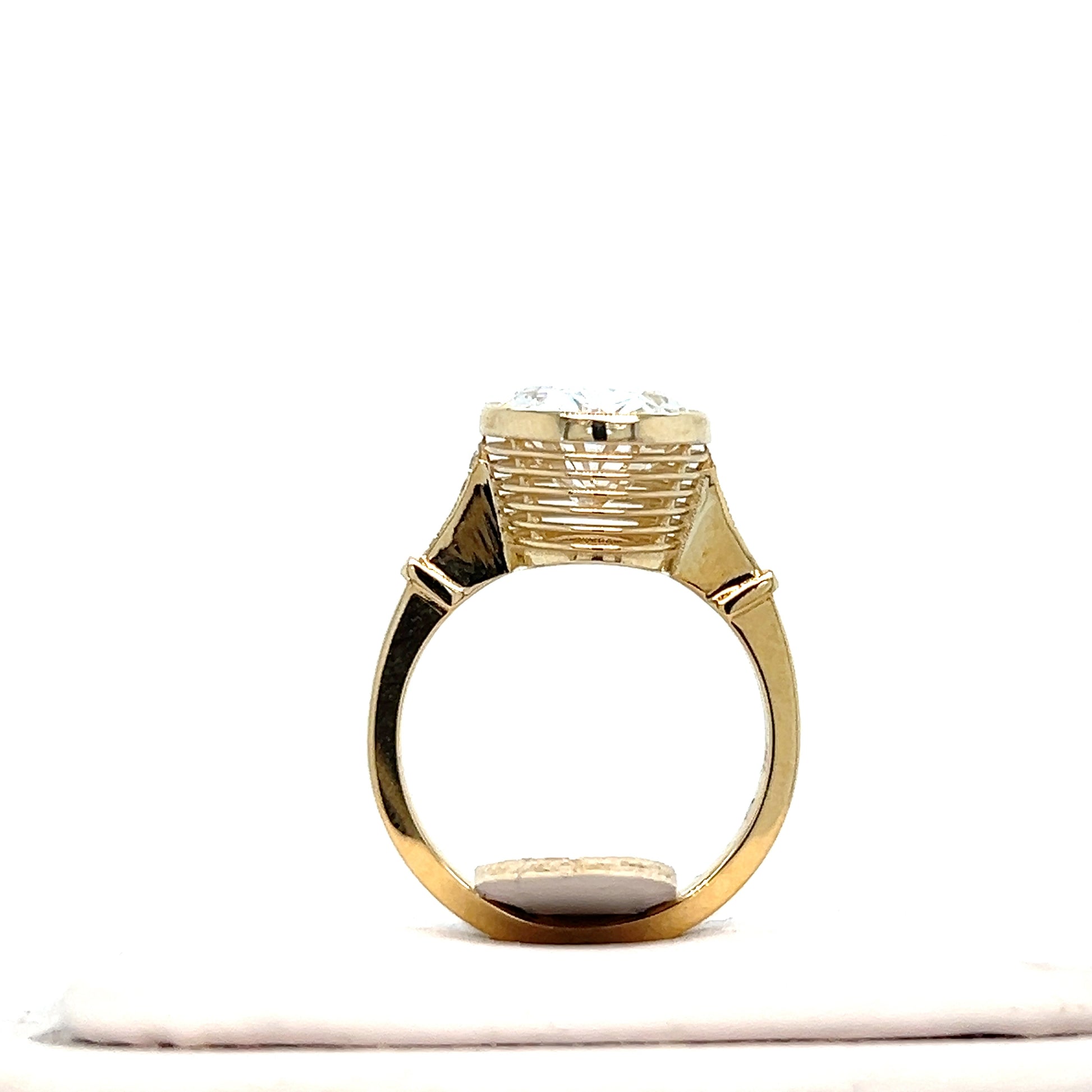 This ring is more than a gift it’s a vow cast in gold. At its center, an oval-cut lab color gemstone of your choice, radiates with brilliance. Held in 12ct solid gold, the band and woven into the basket are delicate accent stones, subtle sparks of light that frame and protect the centerpiece, much like love itself. Bold in its presence yet intricate in its detail, this design reflects strength, devotion, and the beauty found in every lasting bond. Fully