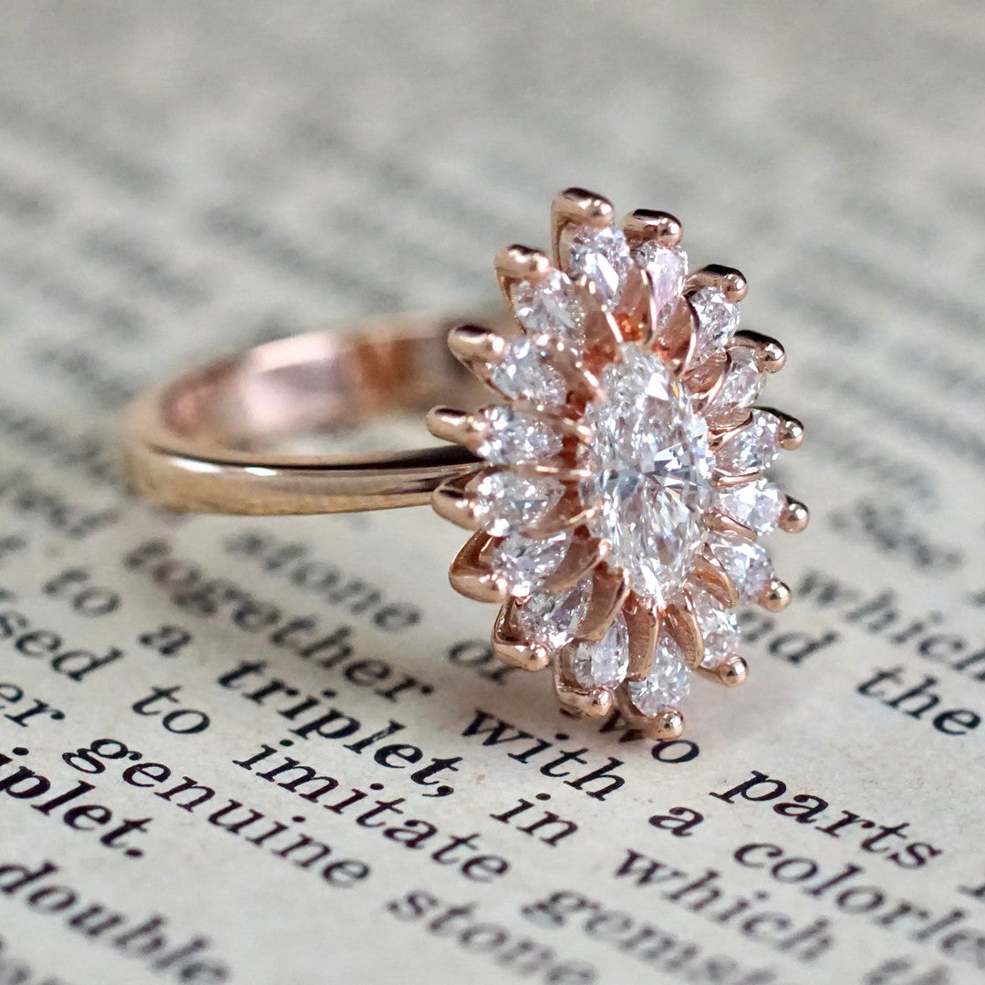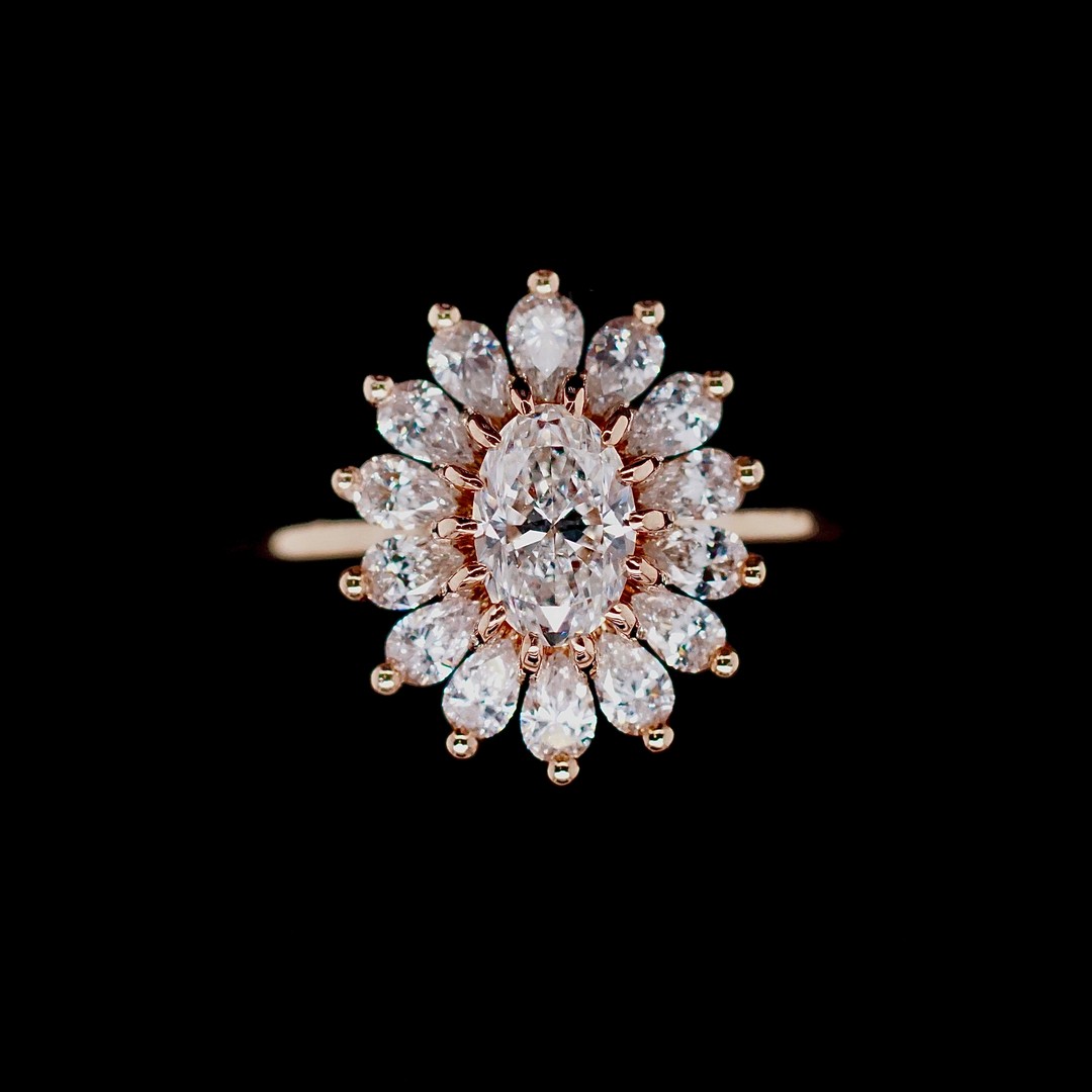 The Everpetal is crafted for the man who believes her love deserves a legacy. A radiant cluster of marquise-cut stones unfurls like a blooming flower, each petal set with intention, circling a brilliant center that captures every flicker of light. The band’s warm embrace holds the bloom in poised grace, symbolizing a promise that doesn’t fade with time. Romantic yet enduring, The Everpetal is not just a ring it’s a vow that her beauty, like this blossom, will remain ever in bloom.