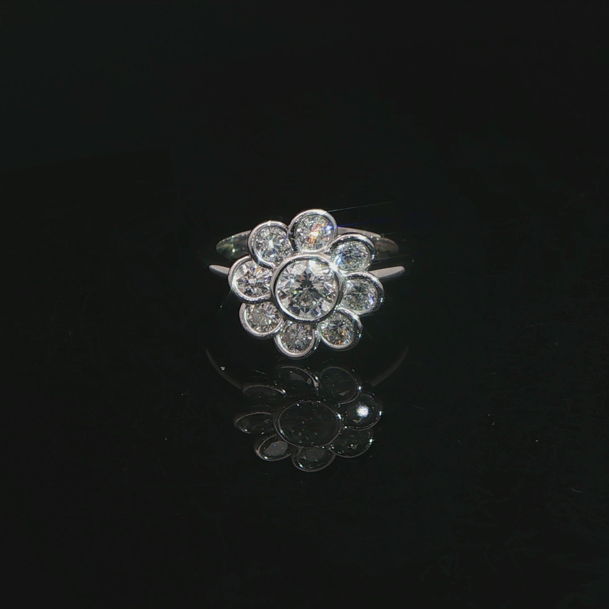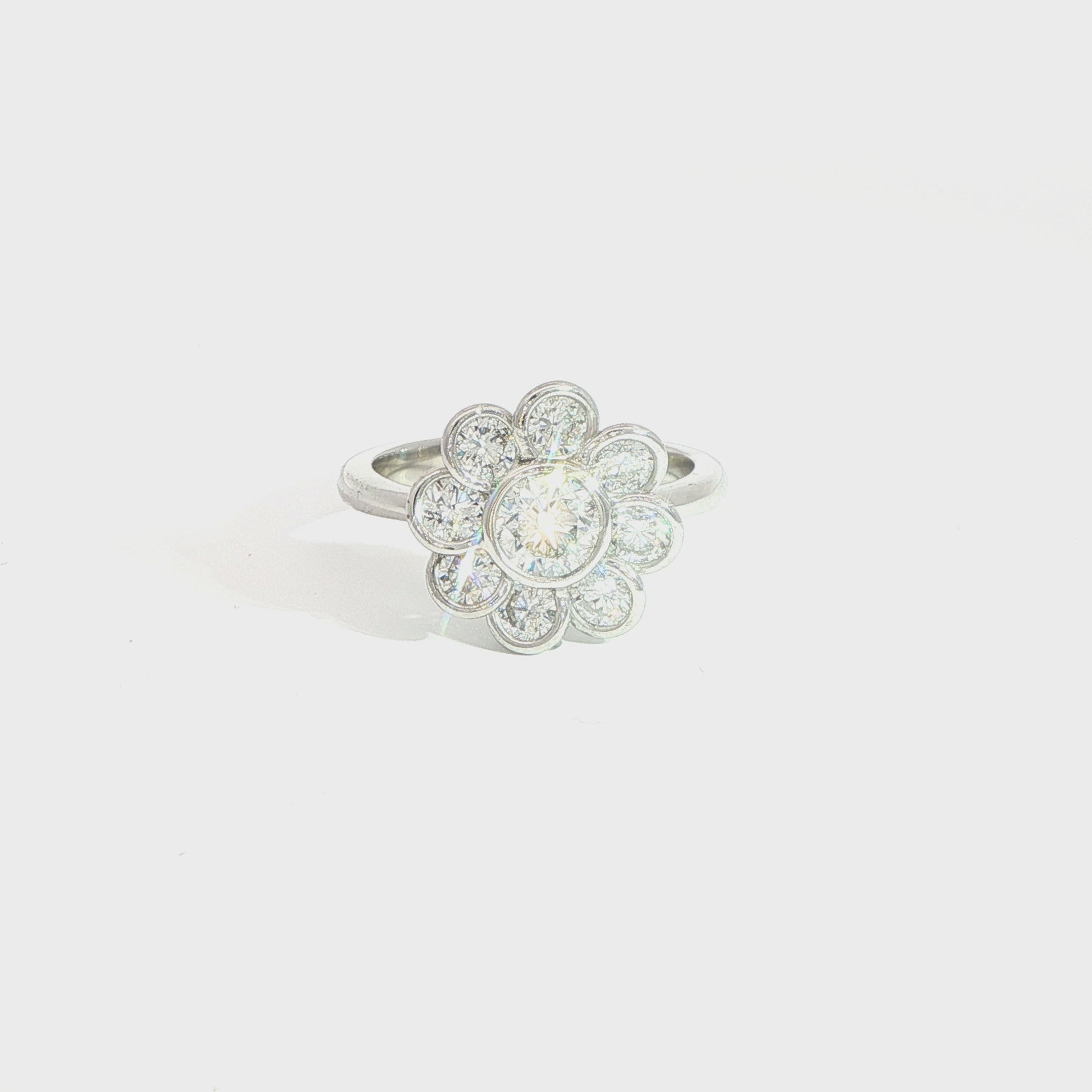 This exquisite cocktail ring showcases a floral-inspired design, crafted from sterling silver with a lustrous white gold finish. The ring features a central round brilliant cut diamond, surrounded by smaller diamonds of the same cut, creating a scintillating halo effect. A remarkable piece of fine jewelry radiating timeless elegance.